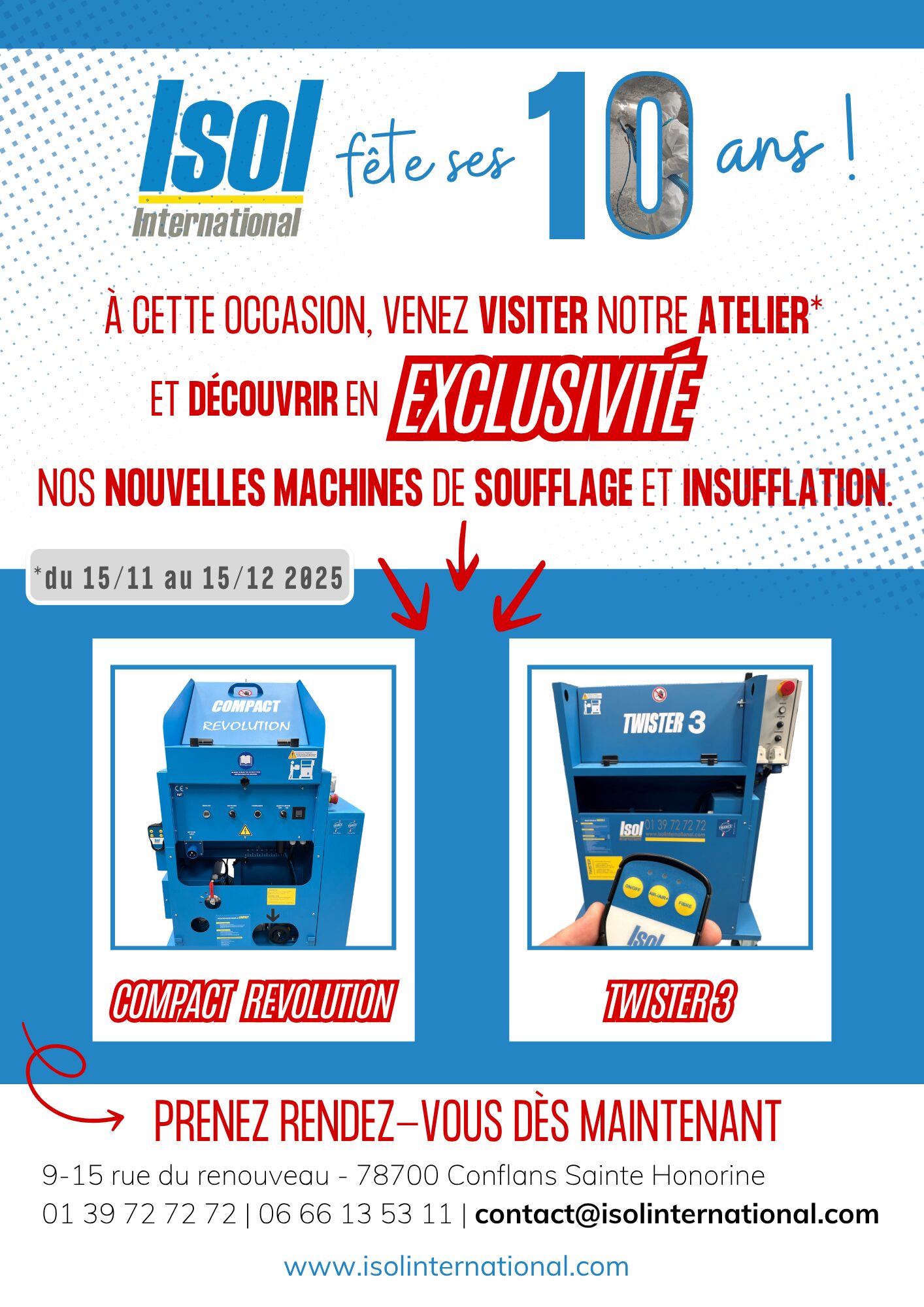 Pour fêter cela, nous vous invitons à découvrir en EXCLUSIVITÉ dans notre atelier nos nouvelles machines de soufflage et d’insufflation ! Pour cela rien de plus simple, il vous suffit de prendre rendez-vous dès maintenant* :