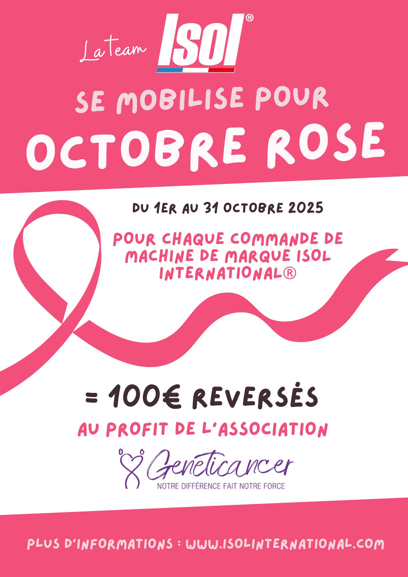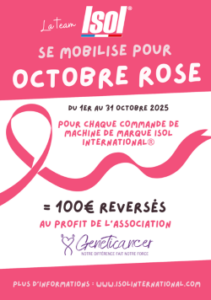 Du 1er au 31 octobre 2025, pour chaque commande de machine de marque ISOL INTERNATIONAL, 100€ seront reversés au profit de l’association.